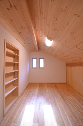 このアングルから見ると一見して平屋に見えますが、実は2階建です。正面の見える部分には杉板を張り、柿渋の赤で仕上げました。隣地側と裏の見えない部分には珪藻土を塗りました。