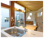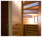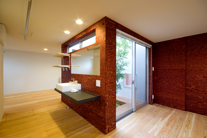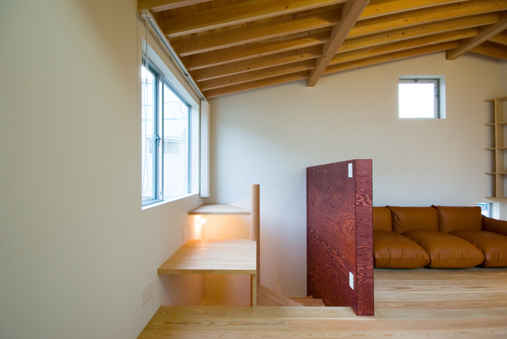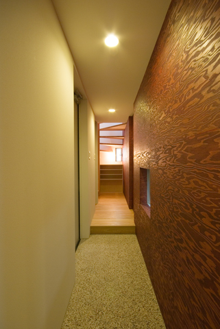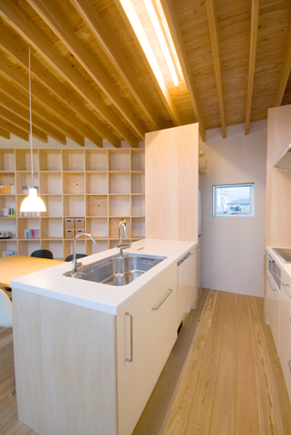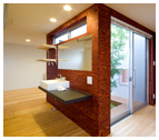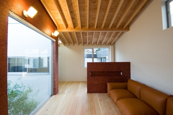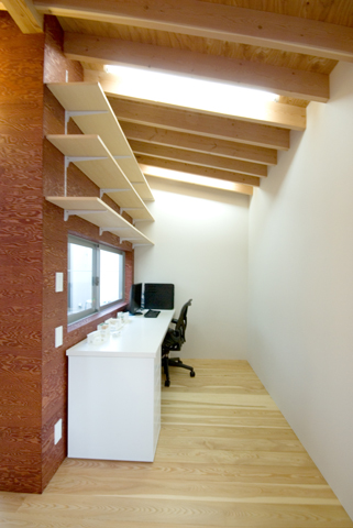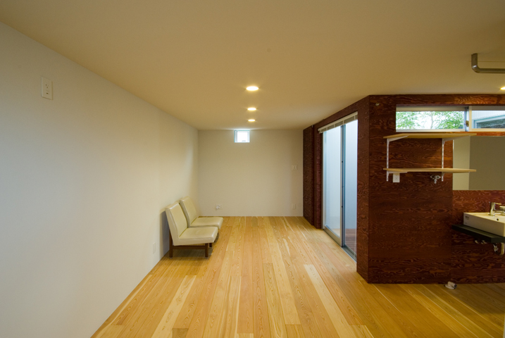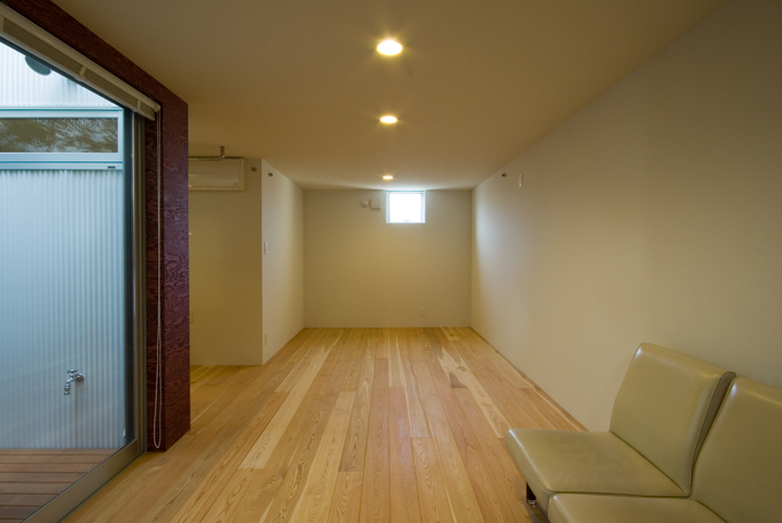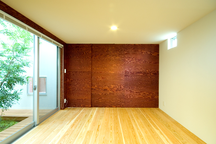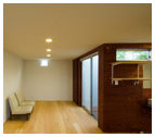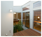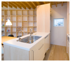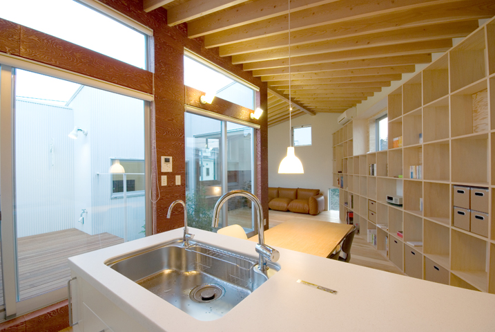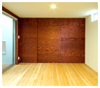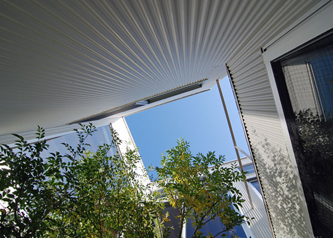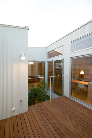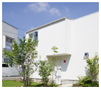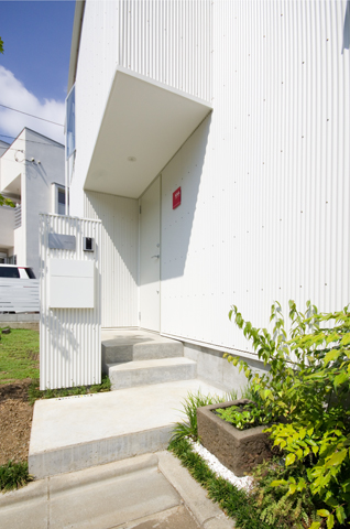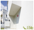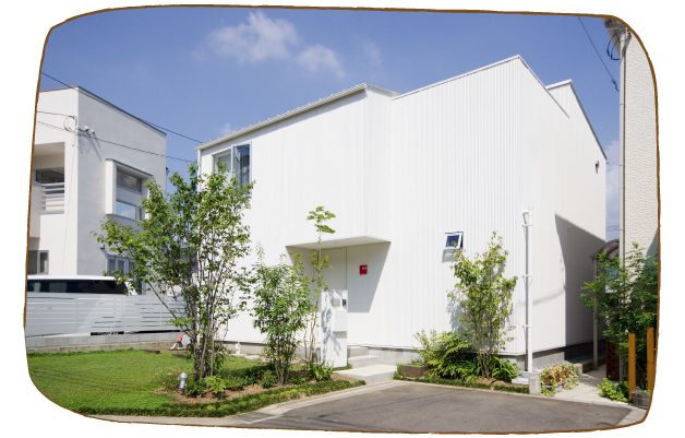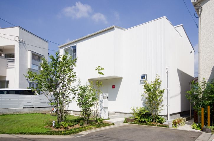 白い外壁と極端に窓の少ない外観が印象的な萩原様邸。壁と屋根はガルバリウム鋼板の波板張りとなっており、軒の出もほぼゼロに近い状態です。庭のデザインは私、村上の手によるものです。いろいろ試行錯誤の連続でしたが、思い切り遊ばせて頂き大満足です。樹木の足元には私の大好きな山野草を植え込んでありますので、四季折々の花を咲かせてくれるでしょう。